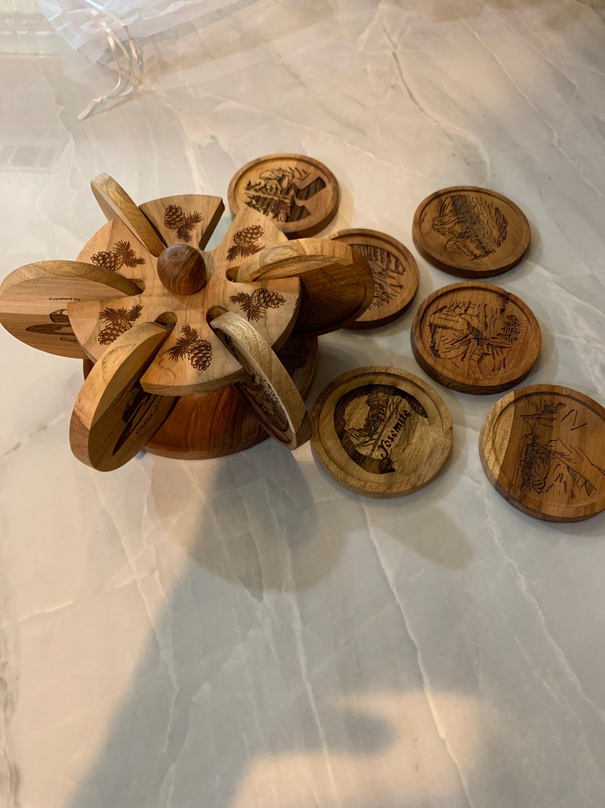 These six teak wood coasters are housed in a unique carousel holder. This beautiful wood is an elegant way to display and relive your memories of Yosemite.